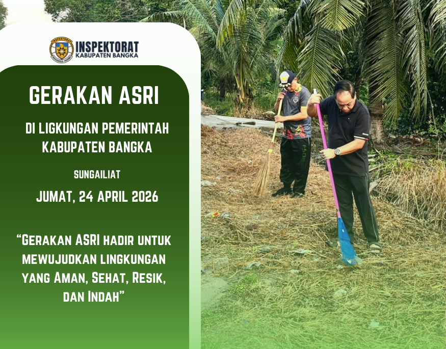 SUNGAILIAT – Inspektorat Kabupaten Bangka telah melaksanakan aksi nyata dalam menjaga kelestarian lingkungan melalui Gerakan ASRI (Aman, Sehat, Resik, Indah) pada Jumat (24/4/2026). Kegiatan ini dilaksanakan sebagai bentuk implementasi nyata terhadap Surat Edaran Menteri Dalam Negeri Nomor 600.11/889/SJ.